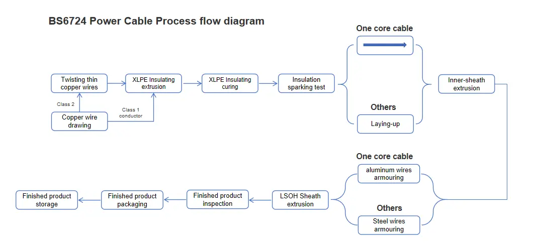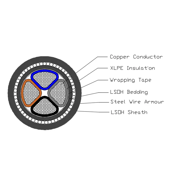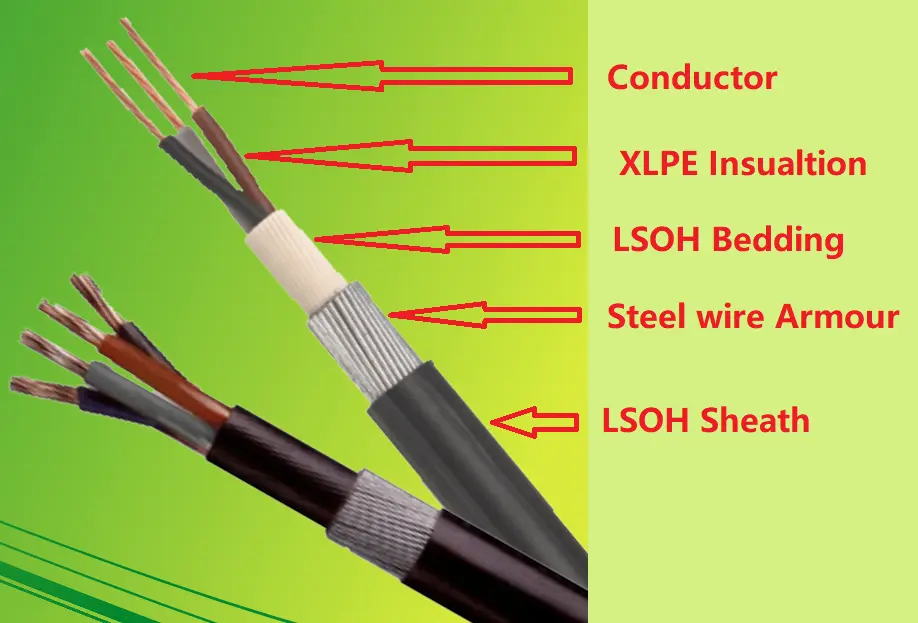 A BS 6724 tápkábel egy T1R rézvezetőből, XLPE szigetelésből, PVC burkolatból, acélgátpáncélból és LSOH köpenyből áll.